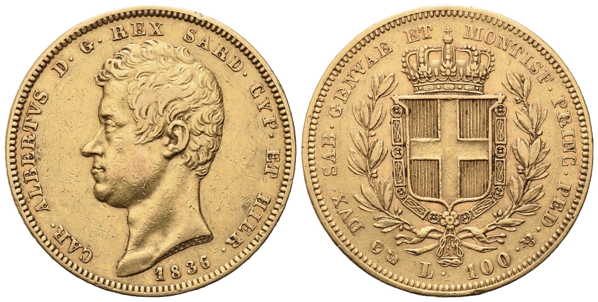 REGNO DI SARDEGNA. Carlo Alberto (1831-1849). 100 lire 1836. Genova. Au (34 mm – 32,22 g). Pagani 142; Gig. 8. BB+