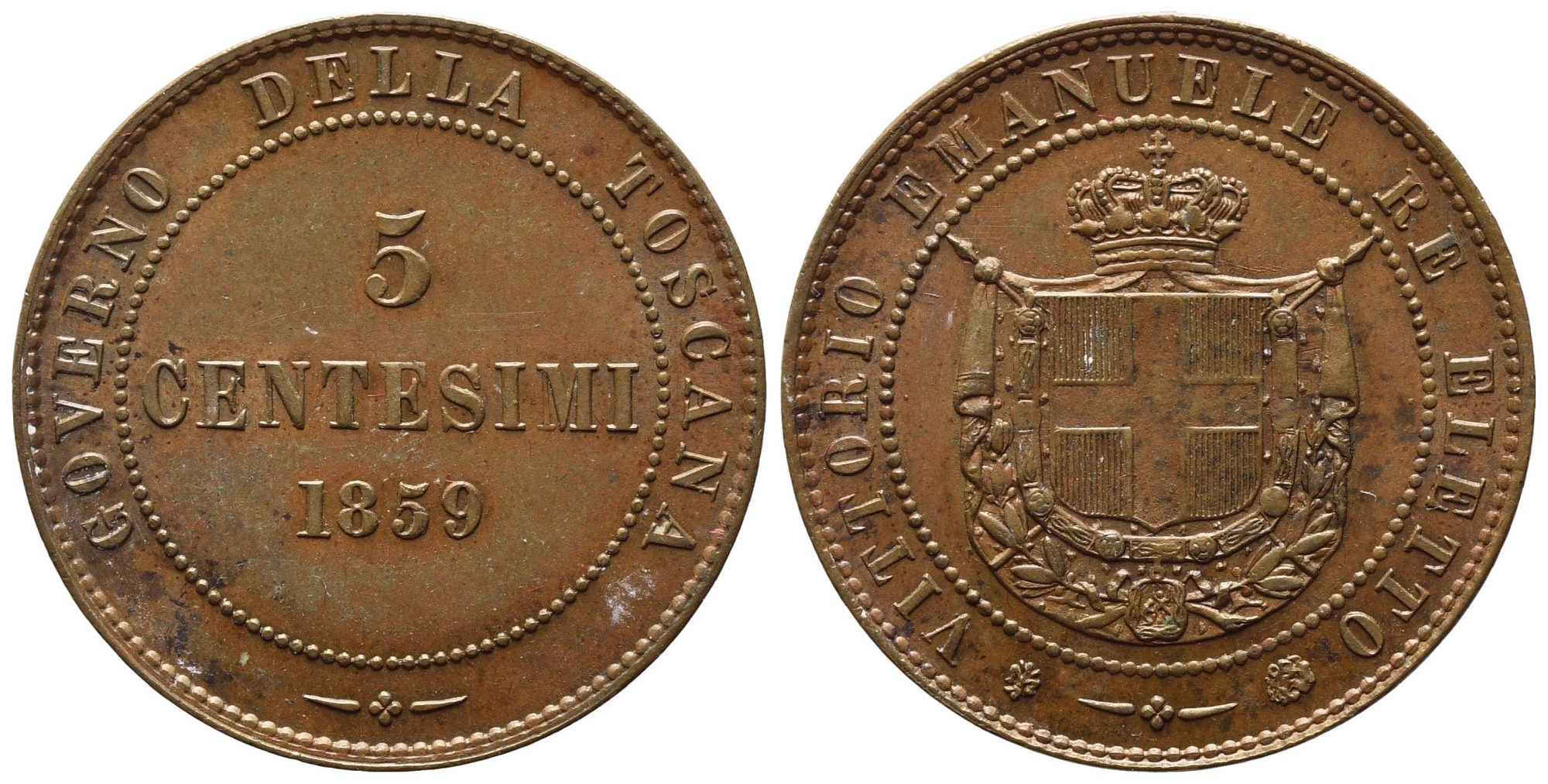 RE ELETTO. Vittorio Emanuele II (1859-1860). 5 centesimi 1859. Cu. SPL