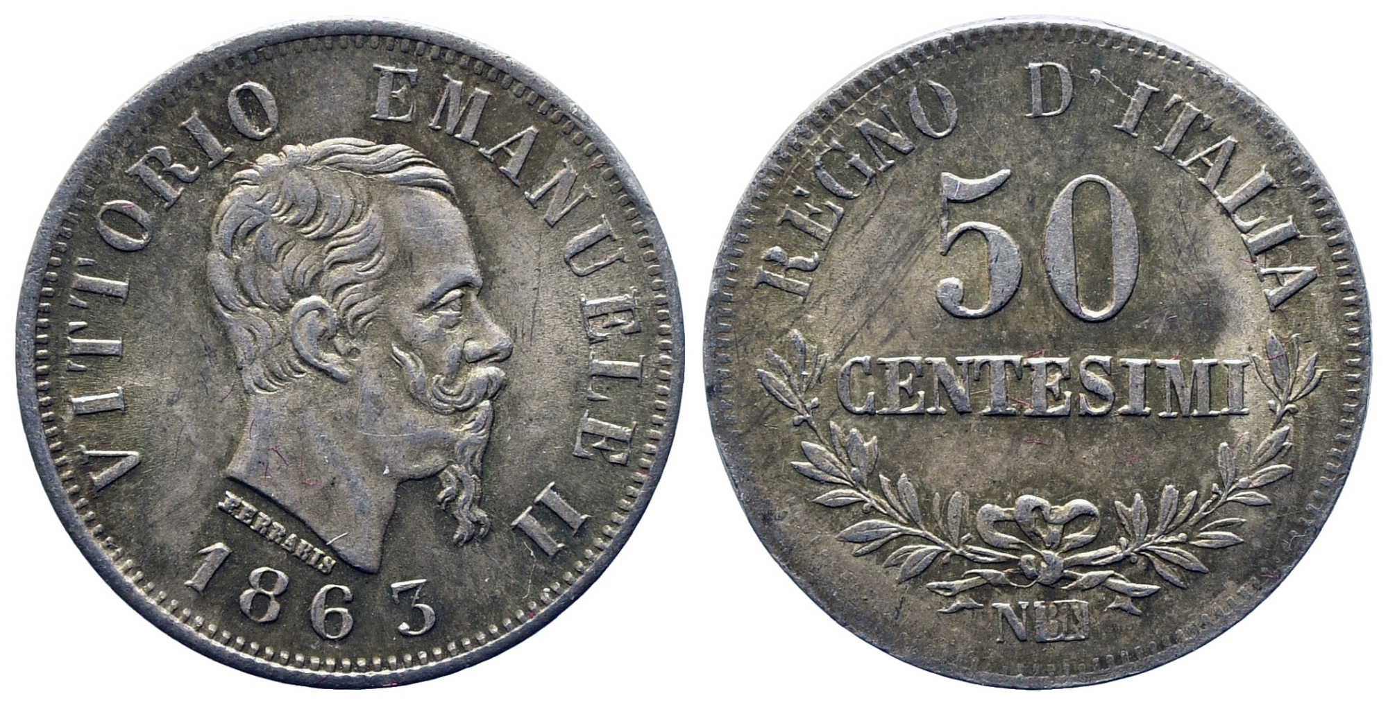 REGNO D'ITALIA. Vittorio Emanuele II (1861-1878). 50 centesimi 1863. Napoli. Valore. Ag. SPL/FDC. Bella patina di antica collezione.