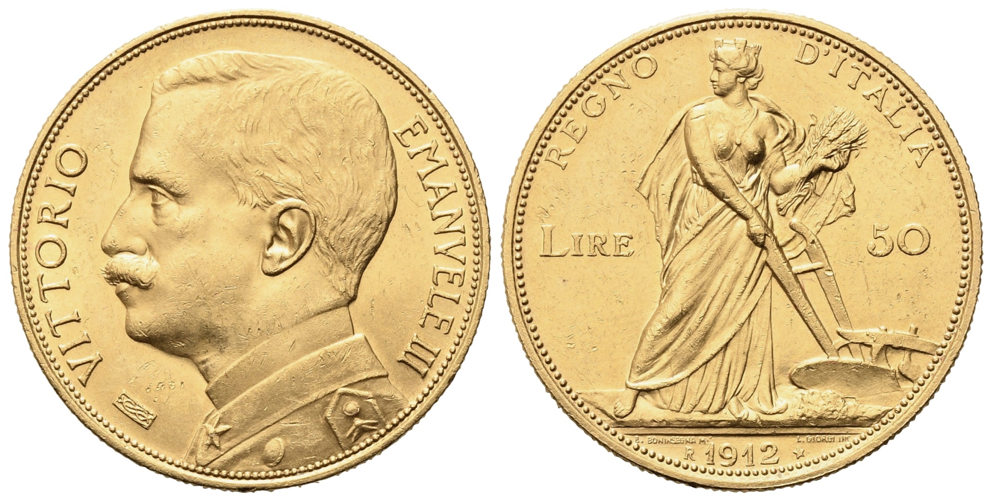 REGNO D'ITALIA. Vittorio Emanuele III (1900-1943). 50 lire 1912 "Aratrice". Au (27,5mm – 16,18 g). Pagani 653; Gig. 16. SPL/qFDC