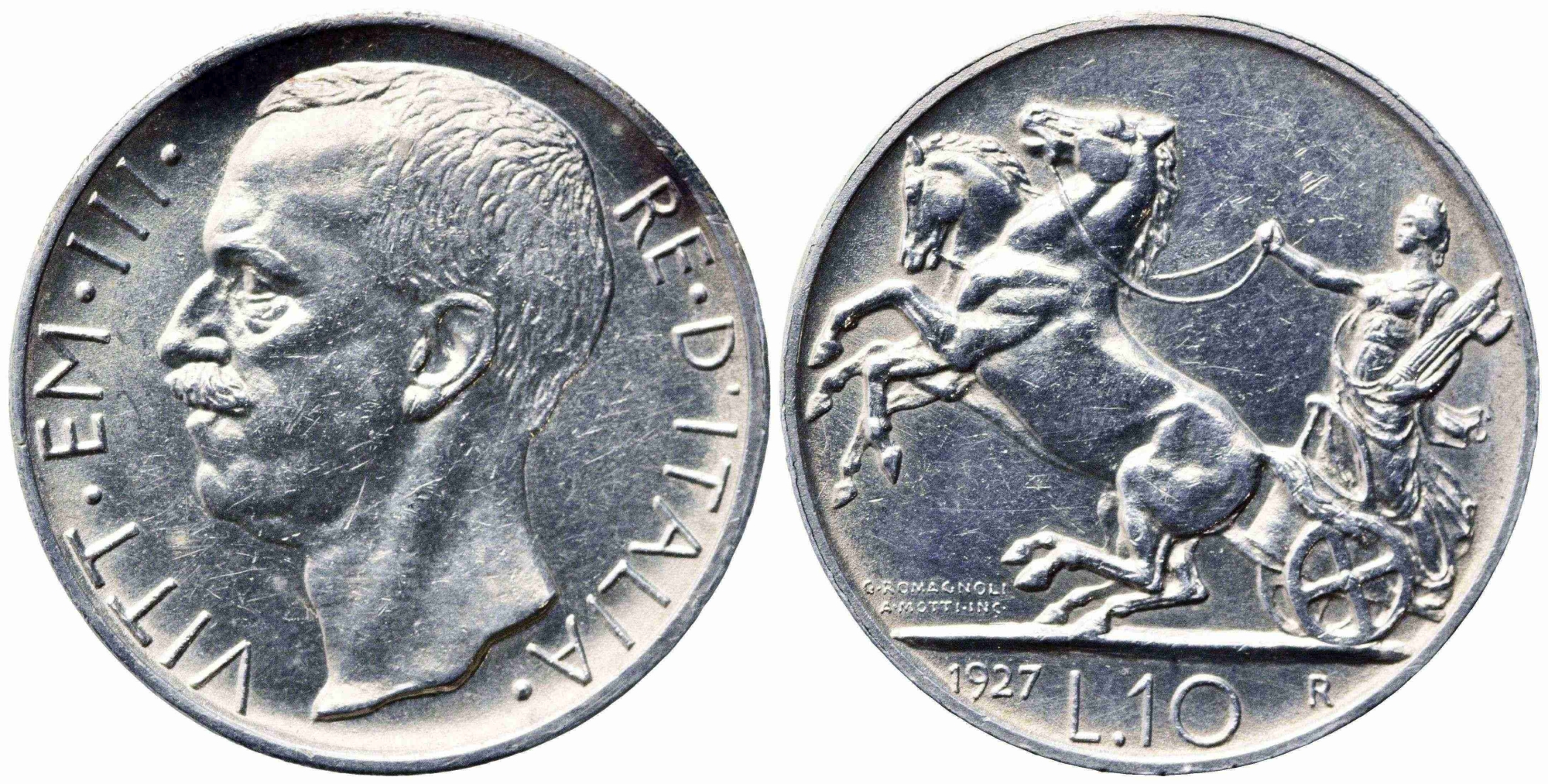 REGNO D'ITALIA. Vittorio Emanuele III (1900-1943). 10 lire 1927 ** due...