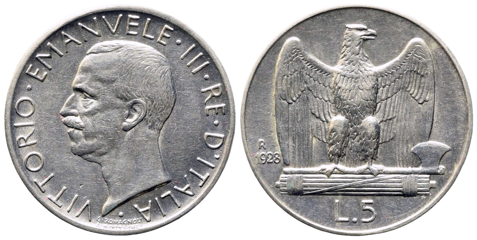 REGNO D'ITALIA. Vittorio Emanuele III (1900-1943). 5 lire 1928 - 2 rosette....