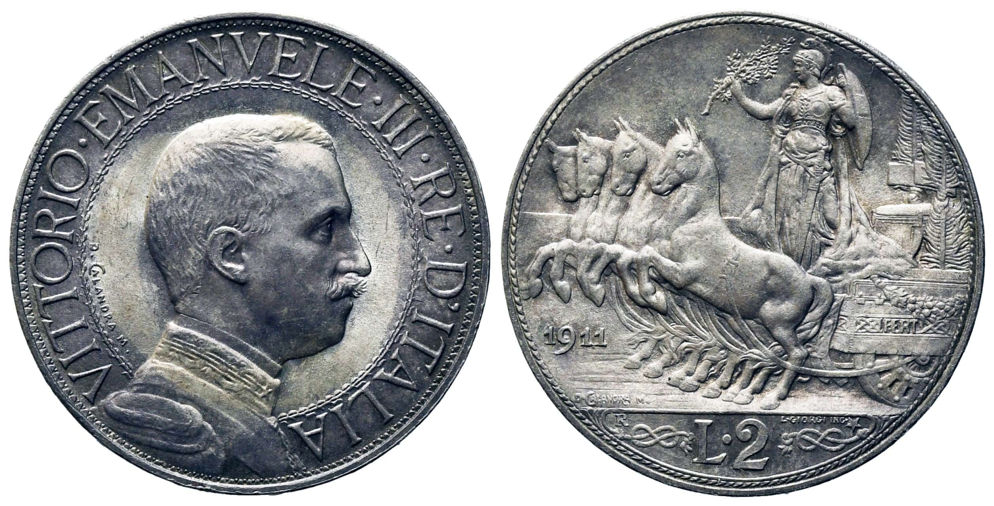 REGNO D'ITALIA. Vittorio Emanuele III (1900-1946). 2 lire "Quadriga Veloce" 1911. Ag (10 g). Gig. 98. RR. qFDC/FDC, rarissima in questa conservazione.