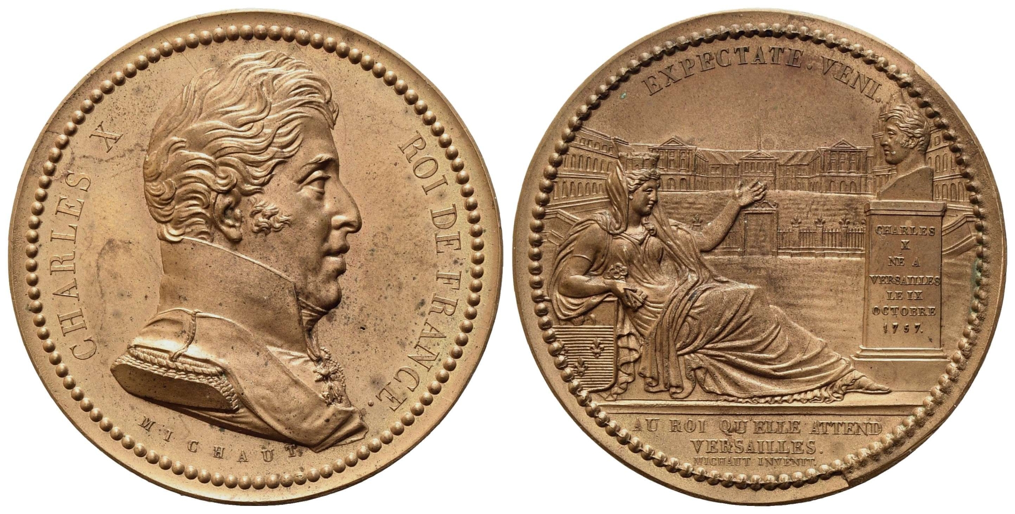 FRANCIA. Carlo X (1757-1836). Medaglia postuma. Ae. Opus A. F. Michaut (52mm). CHARLES X ROI DE FRANCE, Busto volto a ds. con uniforme; sotto il busto, MICHAUT. R/ EXPECTATE . VENI . La Francia seduta verso ds. guarda in direzione di una pietra sulla quale è scritto CHARLES E X A VERSAILLES IX THE OCTOBER 1787; sullo sfondo, la Reggia di Versailles. In esergo,: AU ROI QU'ELLE ATTEND / VERSAILLES . / MICHAUT INVENIT. qFDC