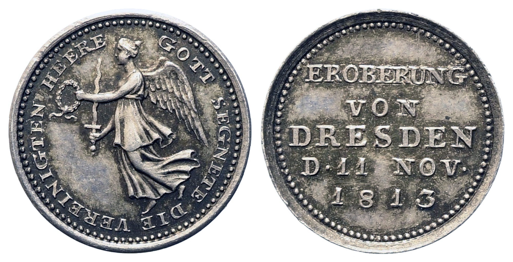 GERMANIA. Medaglia 6a coalizione antifrancese (1812-1814). Presa di Dresda 1813. Ag (15,3 mm – 1,34 g). D/GOTT SEGNETE DIE VEREINIGTEN HEERE; la Vittoria alata verso sinistra con serto e spada. R/EROBERUNG/ VON/ DRESDEN/ D. 11 NOV./ 1813. Bramsen 1280; Julius 2709; Sommer A 165/21. qFDC
