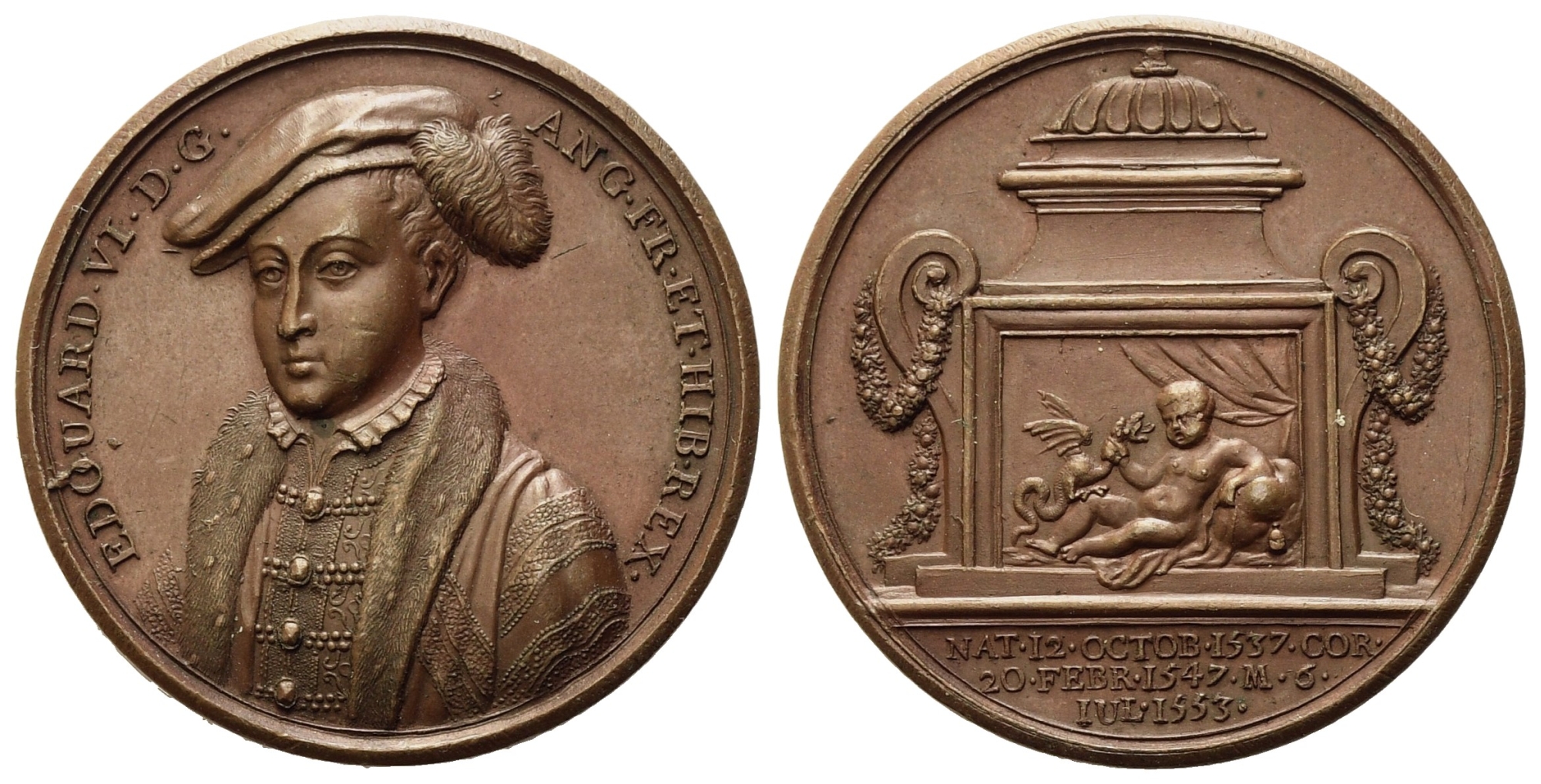 INGHILTERRA. Edoardo VI (1547-1553). Medaglia. Opus J. Dassier. Ae (41mm). EDOUARD VI D G, busto a sinistra. R/ NAT 12 OCTOB 1537 COR 20 FEBR 1547 M 6 LUGL 1553. Ercole bambino strangola dragone. Fusione postuma. SPL
