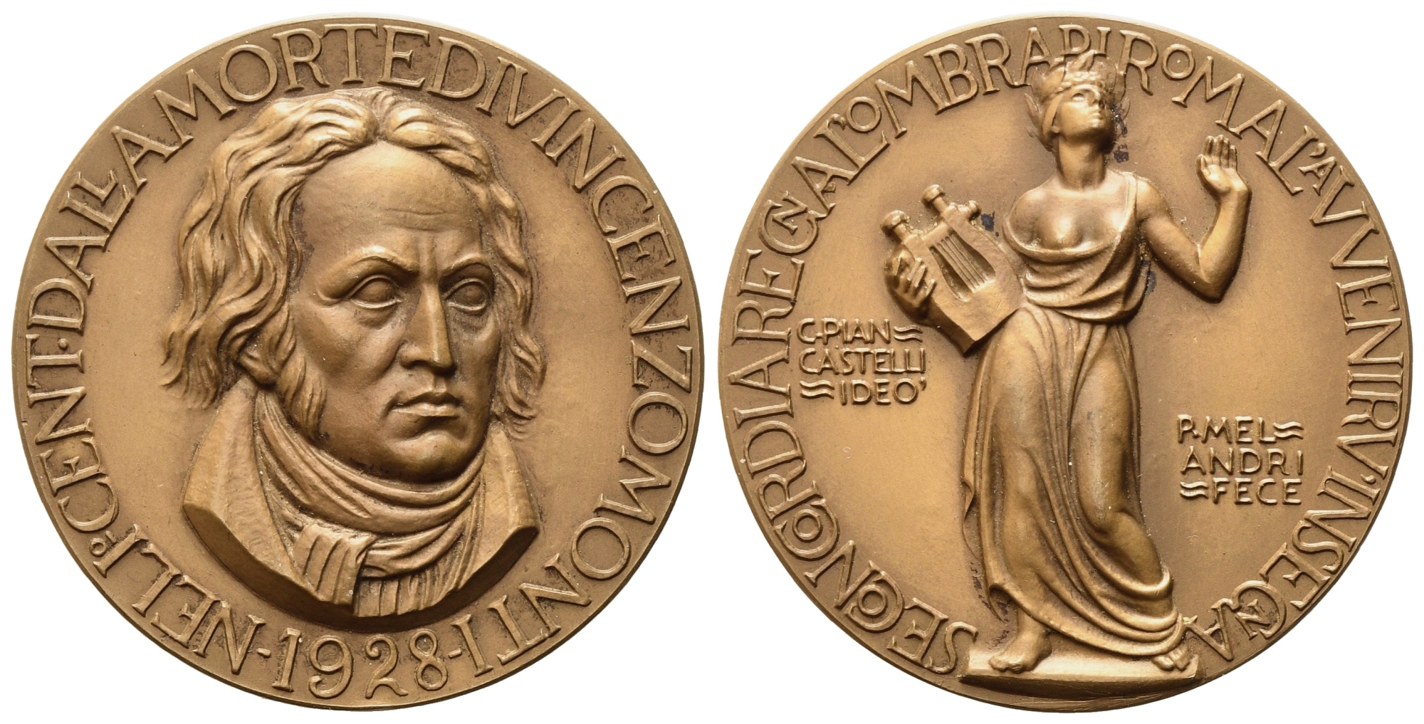 ALFONSINE. Vincenzo Monti (1754-1828). Medaglia 1928 in ricordo del 100° Anniversario della morte di Vincenzo Monti, poeta, scrittore e drammaturgo. Opus P. Melandri. Ae (50 mm.) NEL I° CENT • DALLA MORTE DI VINCENZO MONTI - 1928 - Busto volto di tre quarti a ds. con sciarpa R/ SE CONCORDIA REGNA L'OMBRA DI ROMA L'AVVENIRV' INSEGNA, Rappresentazione di una Musa, di fronte, con una lira. Nel campo, a sn: C. PIAN/CASTELLI/IDEO' , e a ds. P. MEL/ANDRI/FECE. FDC