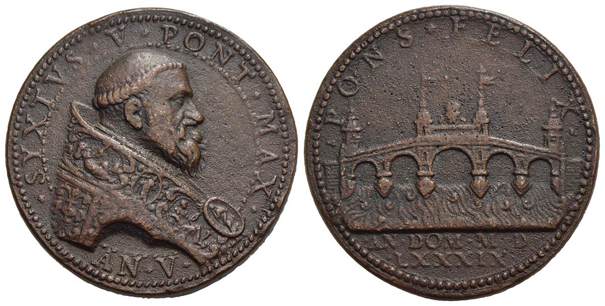 CITTA' DEL VATICANO. Stato pontificio. Sisto V (1585-1590). Medaglia 1589 Anno V. D/Busto a d. con piviale. R/ Ponte Felice. Opus De Bonis. Ae (41 mm – 47,46 g). Fusione posteriore. BB
