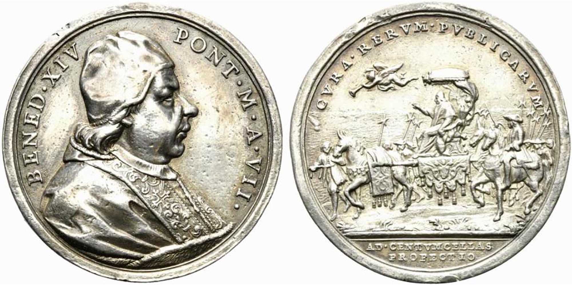 CITTA' DEL VATICANO. Stato Pontificio. Benedetto XIV (1740-1758). Medaglia 1747 coniata Hamerani anno VII "Viaggio a Civitavecchia". Ag (39,7 mm – 25,17 g). D/BENED XIV PONT M A VII; busto a destra con camauro, mozzetta e stola. R/CVRA RERVM PVBLICARVM; rappresentazione del viaggio di Benedetto XIV a Civitavecchia, il Papa seduto su una portantina trasportata da cavalli con corteo papale, in alto un angelo suona la tromba. In esergo su due righe AD CENTVMCELLAS / PROFECTIO. Modesti 225; Pat. 22; Bart. E747. BB colpetti al bordo, segni nei campi.