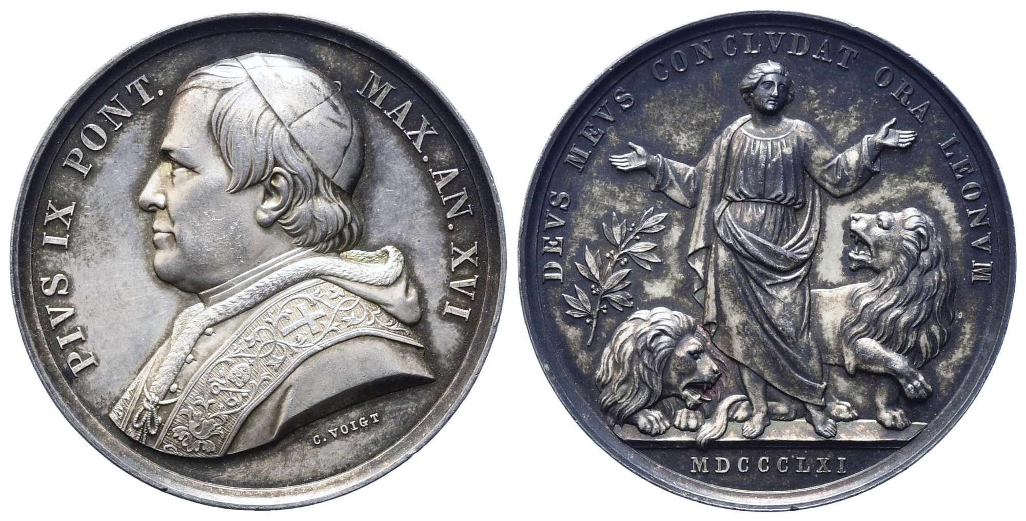 CITTA' DEL VATICANO. Stato Pontificio. Pio IX (1846-1878). Medaglia annuale 1861. Anno XVI. Per le difficoltà del pontefice circondato dai nemici. Opus Carlo Voigt. Ag (43,5 mm). FDC