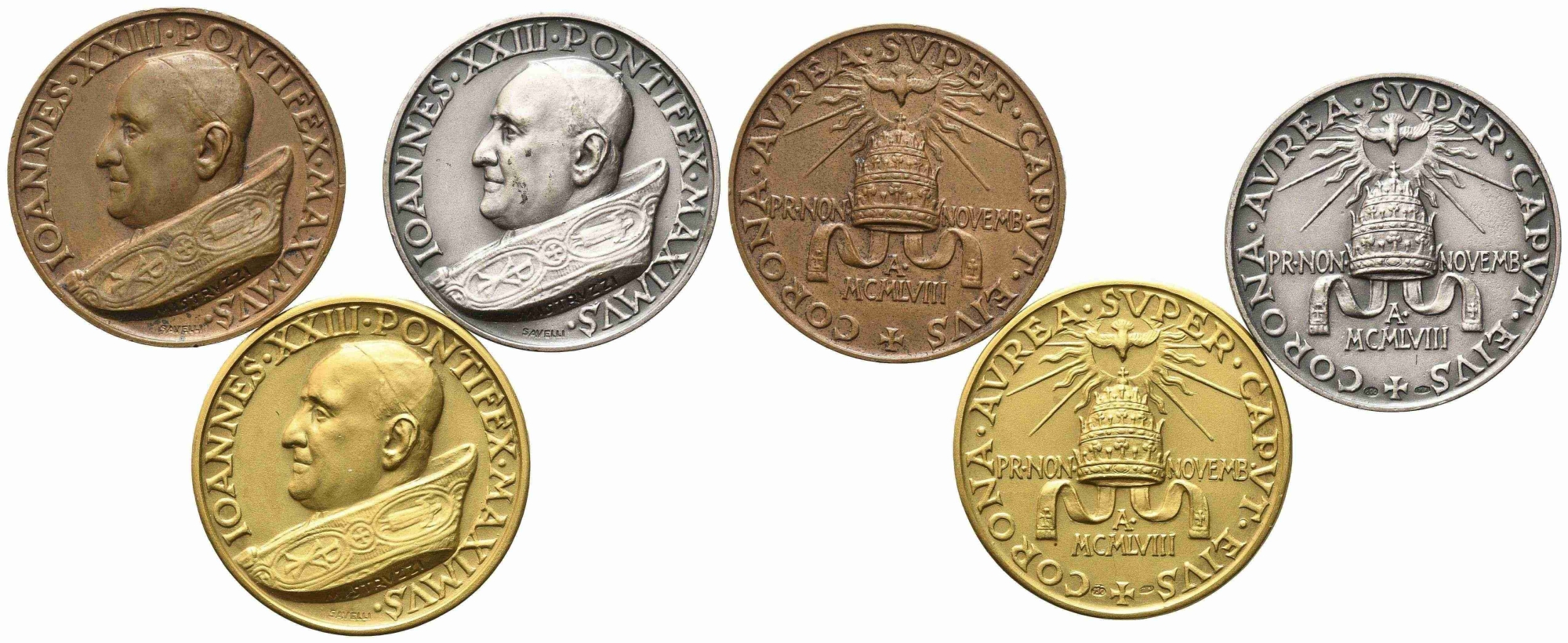 CITTA' DEL VATICANO. Giovanni XXIII (1958-1963). Trittico di medaglie Incoronazione 1958 (Au 18,65 g; Ag 12,56 g; Ae 13,49 g). RRR/R/NC . FDC