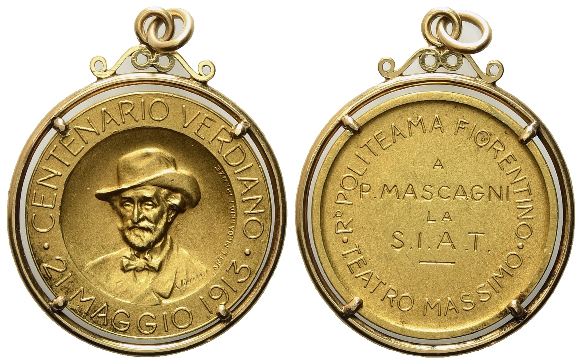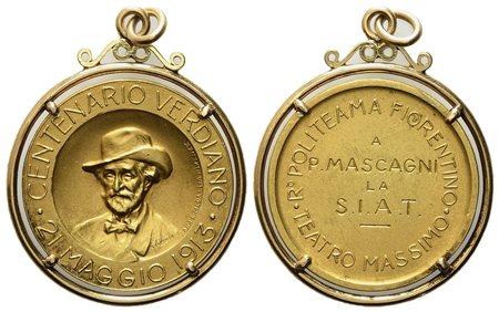 FIRENZE. Medaglia 1913. Centenario verdiano 21 maggio 1913. Busto frontale di Giuseppe Verdi R/ R.° POLITEAMA FIORENTINO – TEATRO MASSIMO. Al centro A P. MASCAGNI/ LA S.I.A.T. Au? (30 mm). Montatura 18 carati. SPL