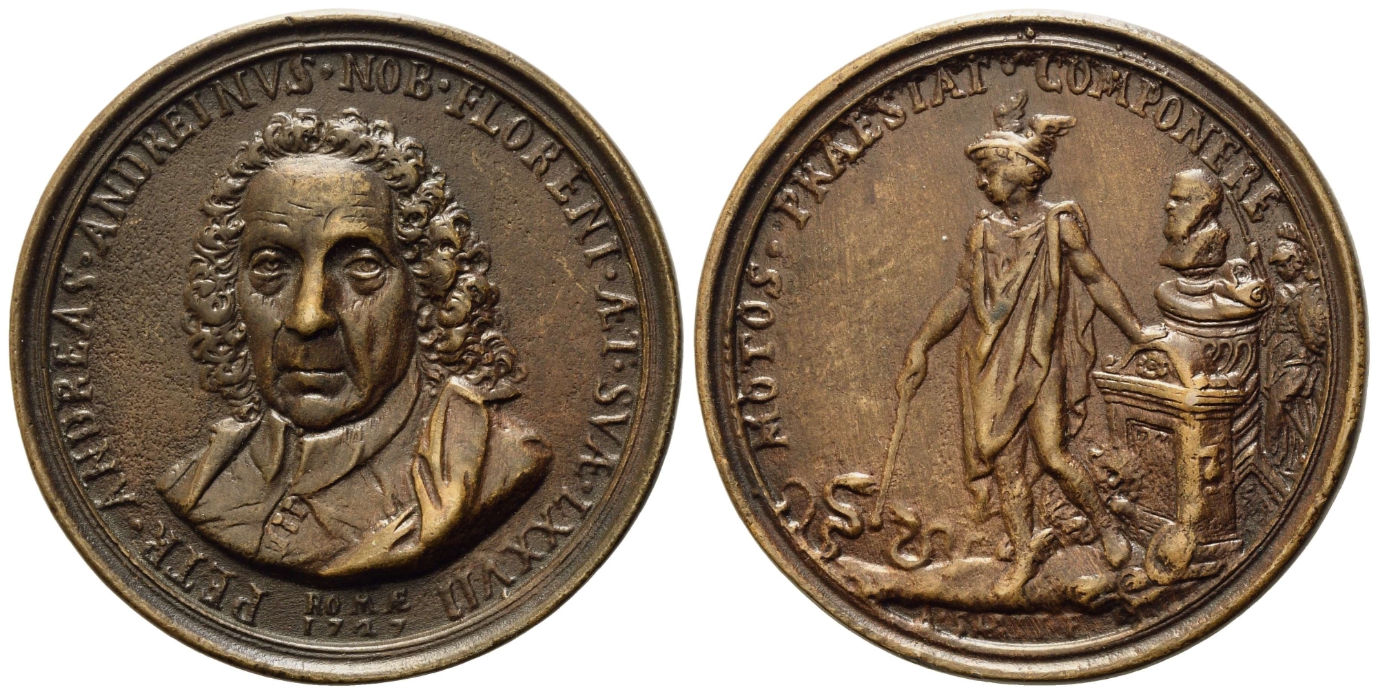 FIRENZE. Pietro Andrea Andreini (1650-1729) Medaglia 1727 (64 mm.) (opus: A. Sorti) PETR·ANDREAS·ANDREINVS· NOB·FLORENI·ÆT·SVÆ·LXXVII, Busto di fronte leggermente volto a sn.; in basso, ROMÆ/1727 in due linee. R/ MOTOS·PRÆSTAT·COMPONERE, Mercurio stante a sn., con un bastone; a terra,due serpenti, e appoggia la mano su una stele; antichità intorno alla base; dietro, busto classico e volute incastonate su una colonna ornata; dietro la colonna, figura di Minerva in piedi a sn. con una lancia e lo scudo; all’esergo A·SARTI·F. Vannel-Toderi (1990) 44; Forrer V, p. 339. AE - SPL
