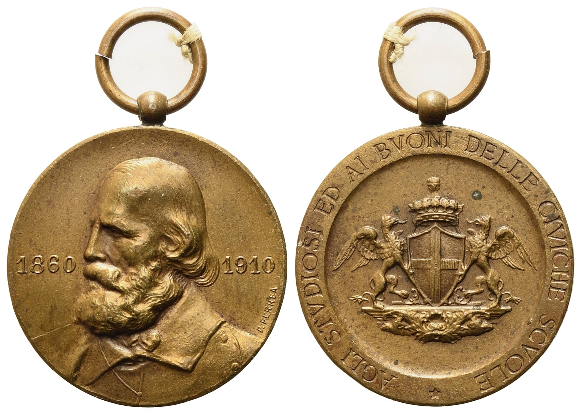 GENOVA. Medaglia "Agli studiosi ed ai buoni delle civiche scuole" 1910. Busto di Garibaldi, stemma della città di Genova. Opus P.Ferrea. Ae (27,5 mm – 8,53 g). SPL