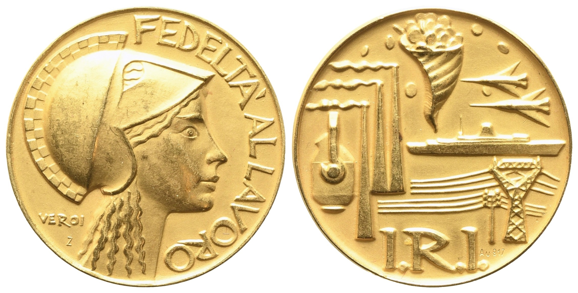 ITALIA. Medaglia "Fedeltà al lavoro". Veroi. D/ Testa di Minerva con elmo corinzio volta a d/ intorno scritta FEDELTA' AL LAVORO, in basso a s/ firma incisore VEROI e segno della Zecca di Stato (Z). R/ Rapprsentazione dello sviluppo industriale (aerei, navi, cornucopia, ciminiere, altoforno, elettrodotti) in basso scritta I.R.I. e titolatura del metallo (AU 917). Au (28 mm – 18,19 g). Emissione per l'Istituto della Ricostruzione Industriale (I.R.I.). SPL+