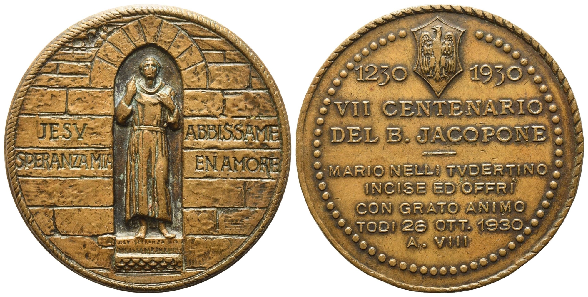 ITALIA. Medaglia 1930 A. VIII - VII Centenario Jacopone da Todi. Opus Nelli. Ae (50 mm). SPL