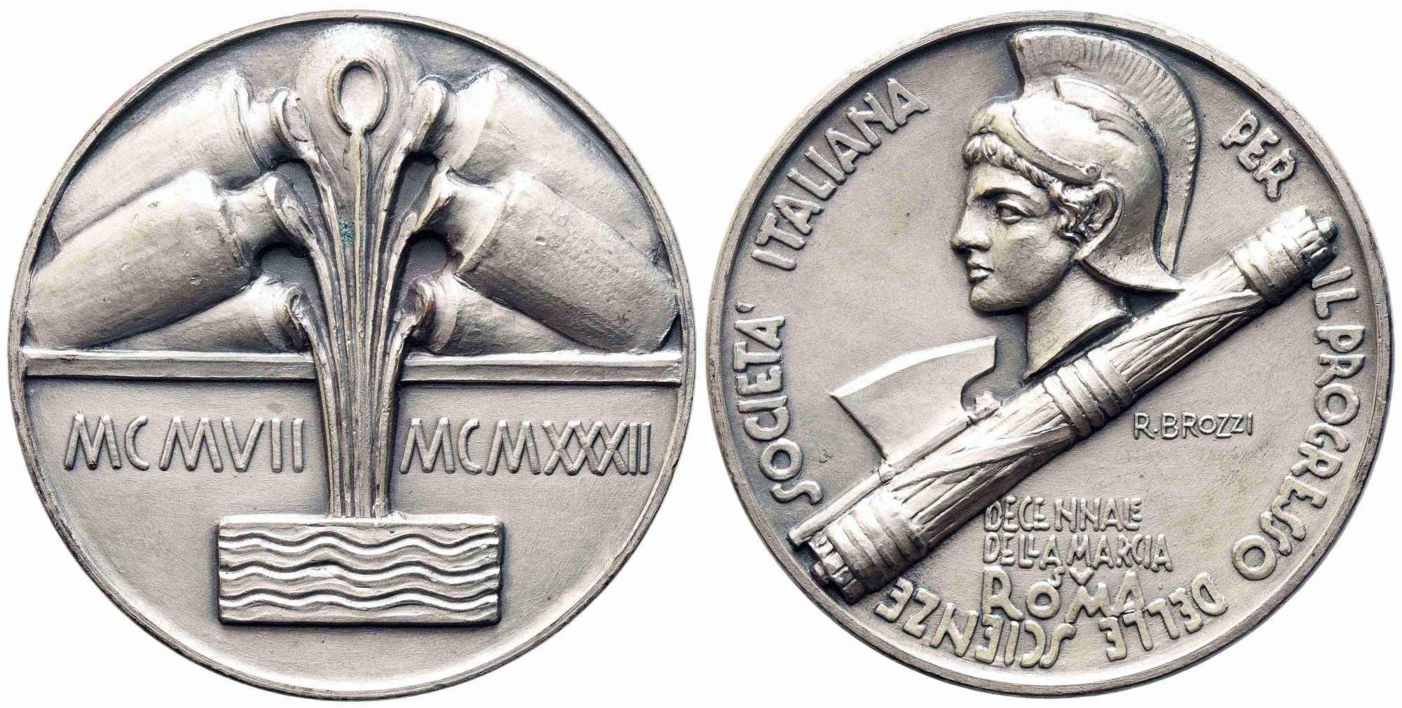 REGNO D'ITALIA. Medaglia 1932 Società Italiana per il Progresso delle Scienze. Decennale della Marcia su Roma. Opus R. Brozzi. Bronzo argentato (51 mm). R. qFDC