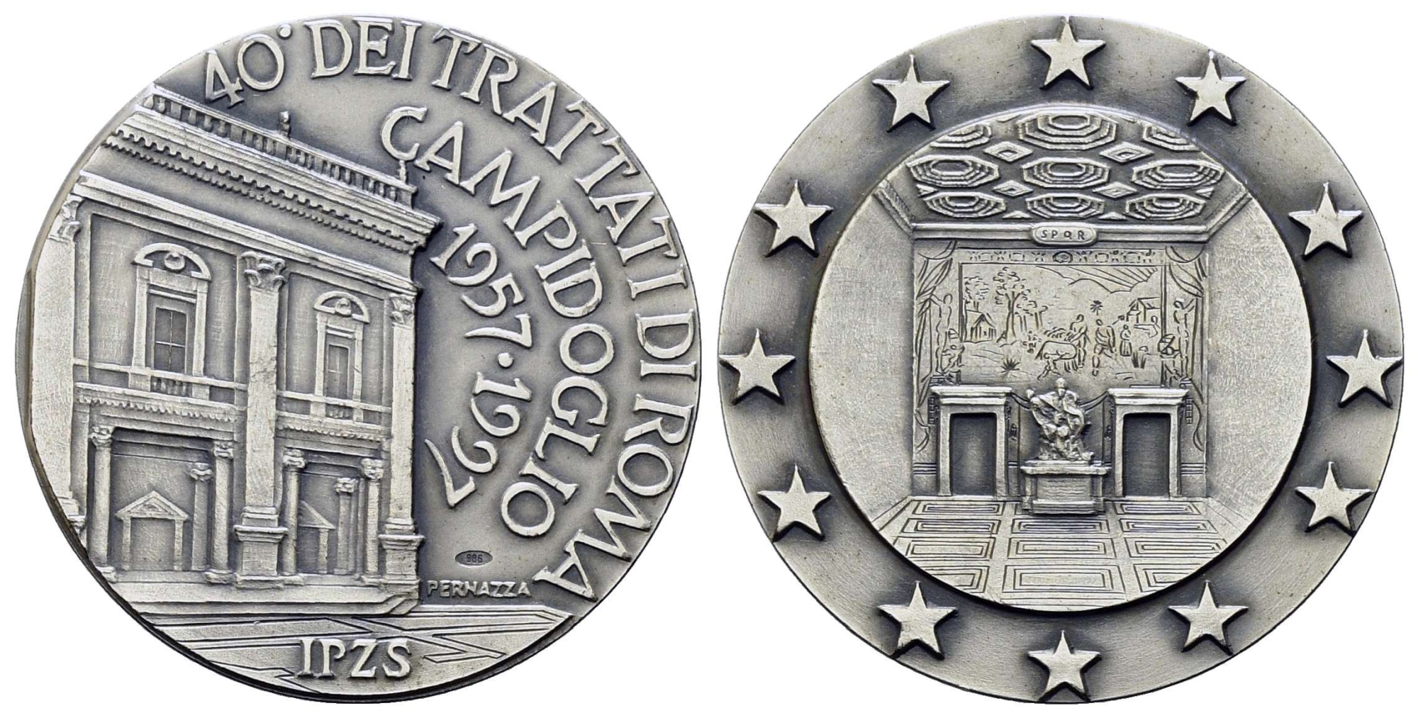 REPUBBLICA ITALIANA. Medaglia 40° Anniversario Trattati di Roma 1997. Ag (40 mm – 31,10 g). In astuccio originale. FDC