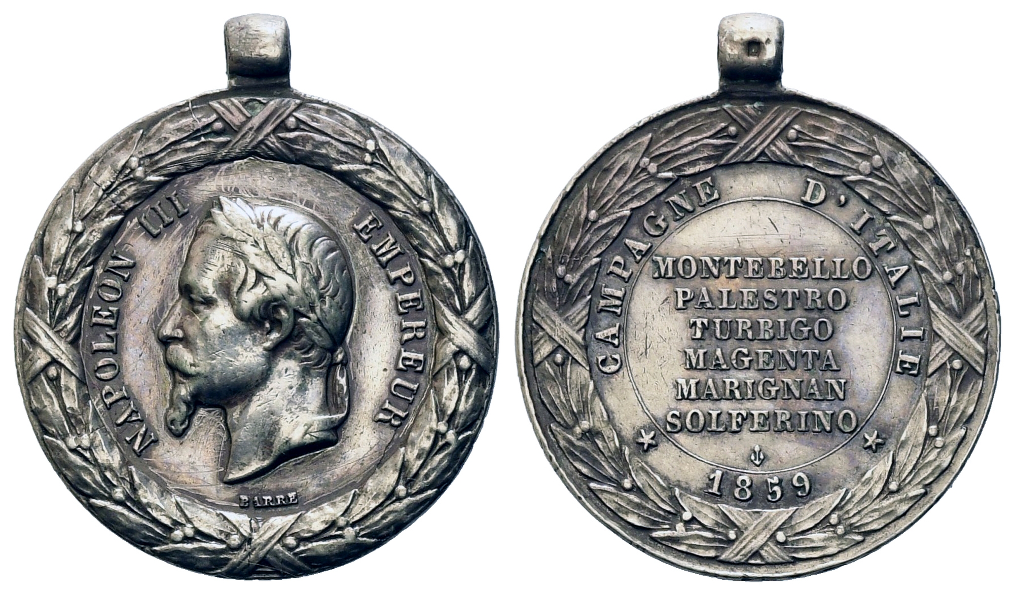 SOLFERINO. Medaglia commemorativa con anello di sospensione rotondo a palla per la campagna d'Italia del 1859 di Napoleone III (1852-1870). NAPOLEON III EMPEREUR, busto di Napoleone III entro corona di alloro R/ CAMPAGNE D’ITALIE 1859, MONTEBELLO/ PALESTRO/ TURBIGO/ MAGENTA/ MARIGNAN/ SOLFERINO entro corona d’alloro. Ag (35x 31 mm). Bram. Pag. 272. qSPL