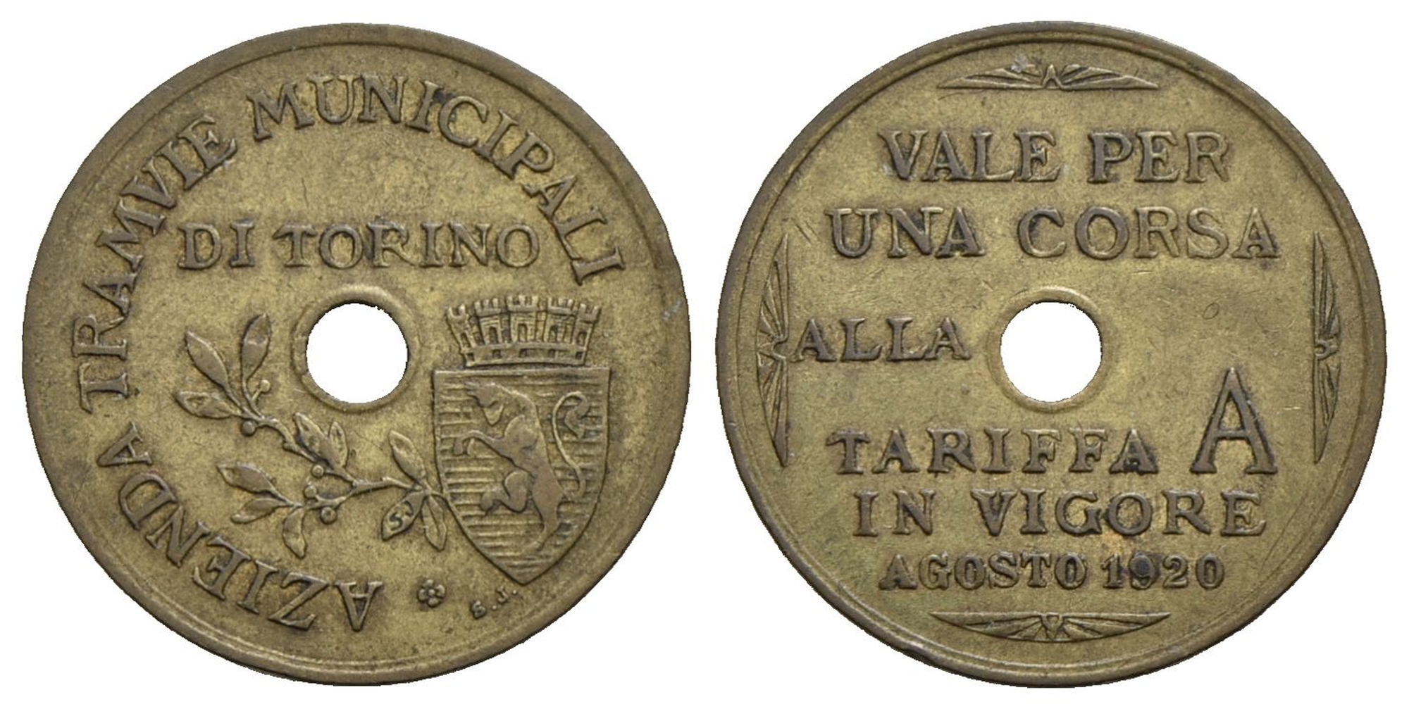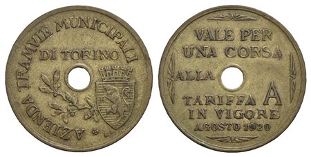 TORINO. Durante Vittorio Emanuele III (1900-1943). Gettone Azienda Tramvie Municipali di Torino 1920. AZIENDA TRAMVIE MUNICIPALI DI TORINO, Stemma di Torino con ramo di lauro. R/ VALE PER/ UNA CORSA /ALLA /TARIFFA A /IN VIGORE /AGOSTO 1920. Opus S. J. Ot (23 mm). R. qSPL