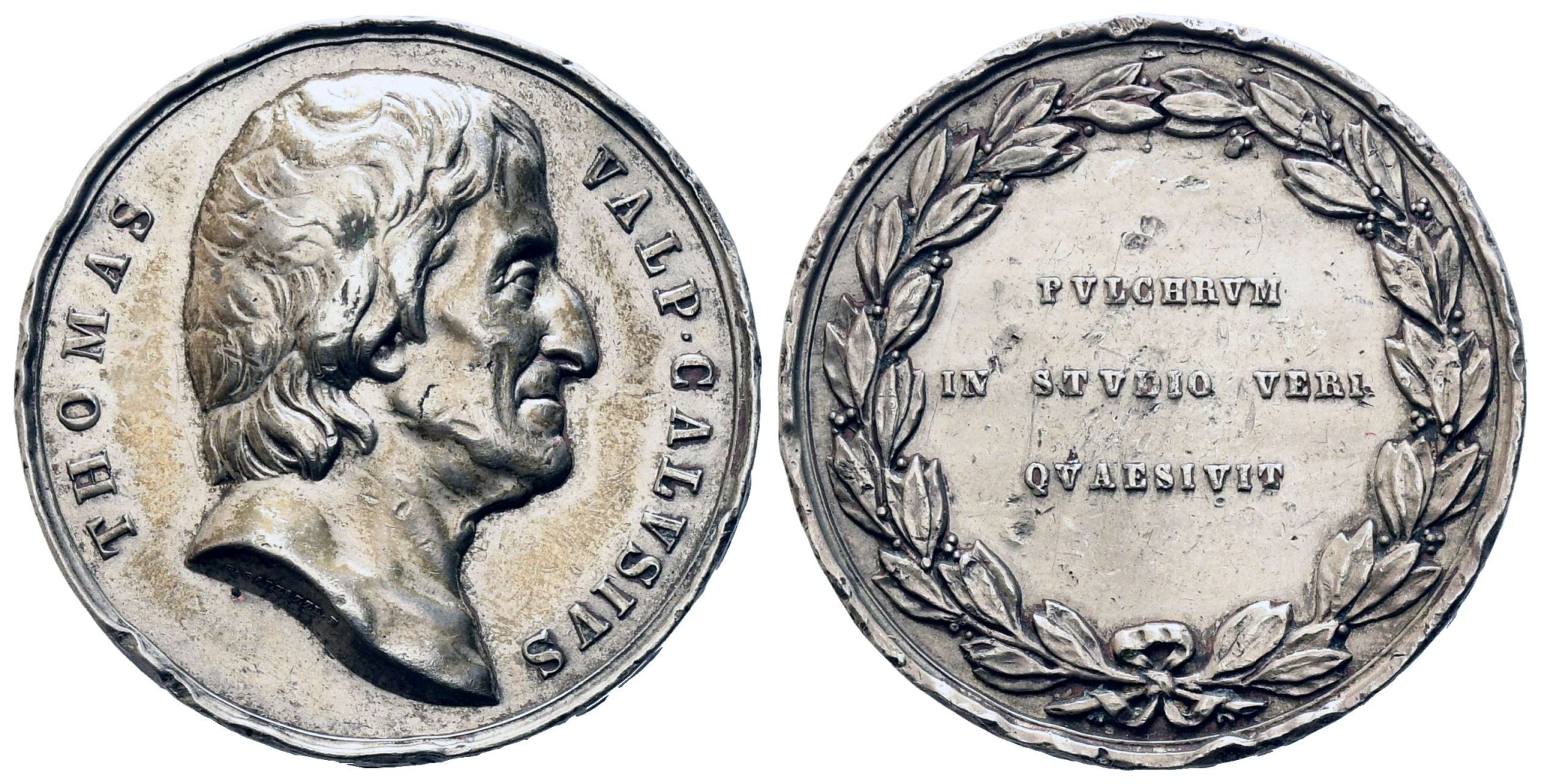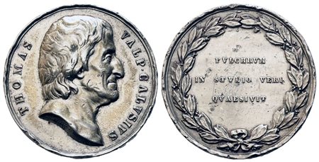 TORINO. Thomas Valperga di Coluso, scienziato, filosofo, astronomo, fisico e matematico (1737-1815). Medaglia. THOMAS VALP CALVSIVS Testa a ds. R/ PVLCHRVM/ IN STVDIO VERI/ QVAESIVIT in corona. Opus G. Galeazzi. Ag (43 mm). Pennestri 401-21; Martini-Turricchia 1869-1871. Colpi sul bordo e nei campi. BB+