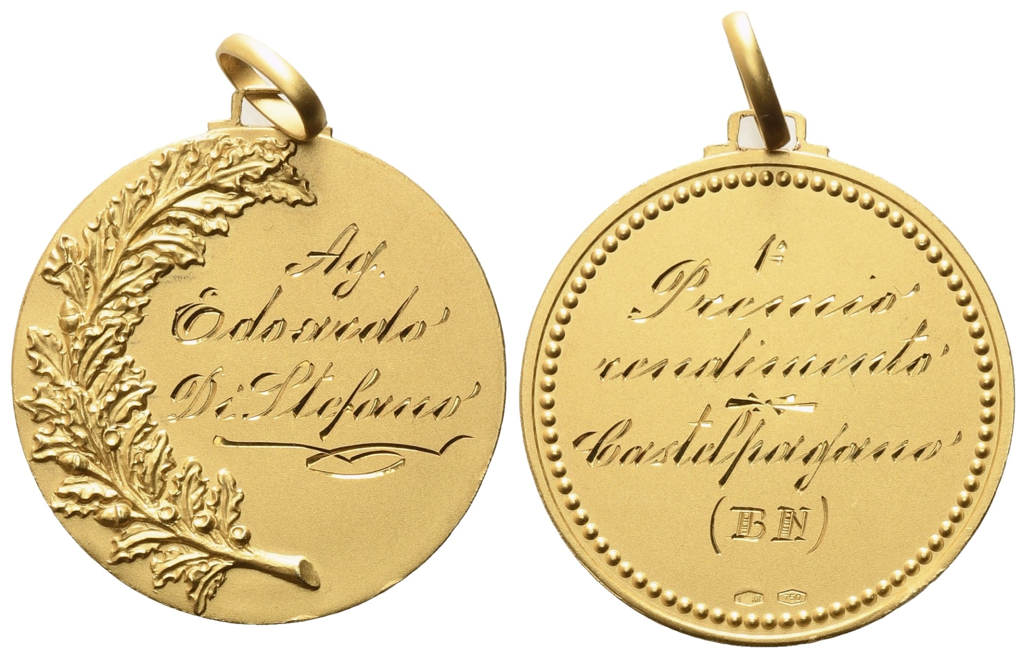VARIE. Medaglia Premio senza data primo premio rendimento Castel Pagano Benevento. Con appiccagnolo, incisa. Au (36,30 mm – 18,55 g). FDC