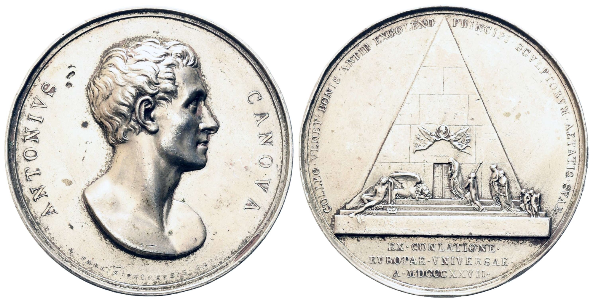 VENEZIA. Antonio Canova, scultore (1757-1822). Medaglia 1827 per il Mausoleo del Canova nella Chiesa dei Frari a Venezia. ANTONIVS CANOVA Busto a ds.; sotto, nel giro, A. FABRIS VTINENSIS SCVLP. R/ COLLEG VENET BONIS ARTIB EXCOLEND PRINCIPI SCVLPTORVM AETATIS SVAE Il Mausoleo del Canova; all’esergo, EX CONLATIONE/ EVROPAE VNIVERSAE/ A MDCCCXXVII. Opus Antonio Fabris. Ae argentato (52 mm). Saracino 3. Medagliere Risorgimento 407. R. SPL+