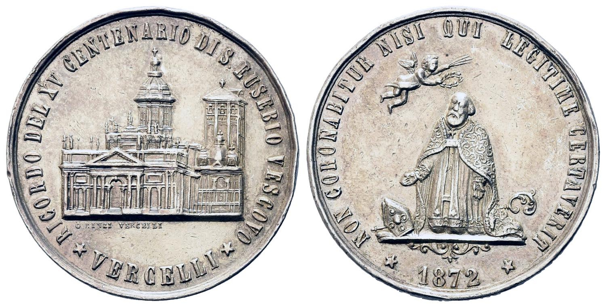 VERCELLI. Medaglia 1875 per il XV centenario di S. Eusebio vescovo. Facciata della chiesa di S. Eusebio R/ S. Eusebio Vescovo inginocchiato. Opus Rinzi. Ag (40 mm – 20,65 g). SPL. Colpetti al bordo.