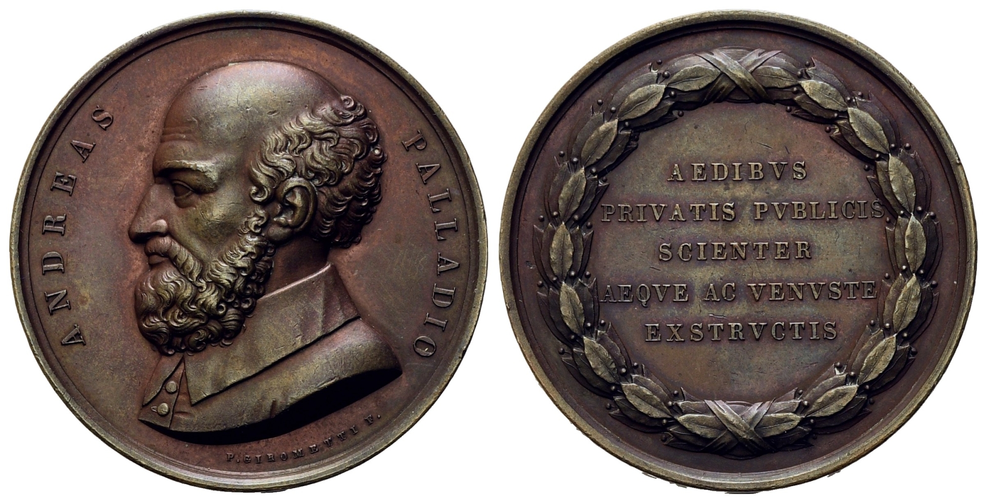 VICENZA. Andrea Palladio (1508-1580). Medaglia commemorativa. ANDREAS PALLADIO, Busto a sn. R/ AEDIBVS/ PRIVATIS PVBLICIS/ SCIENTER/ AEQVE AC VENVSTE/ EXSTRVCTIS in corona. Opus P. Girometti. Ae (41 mm). SPL