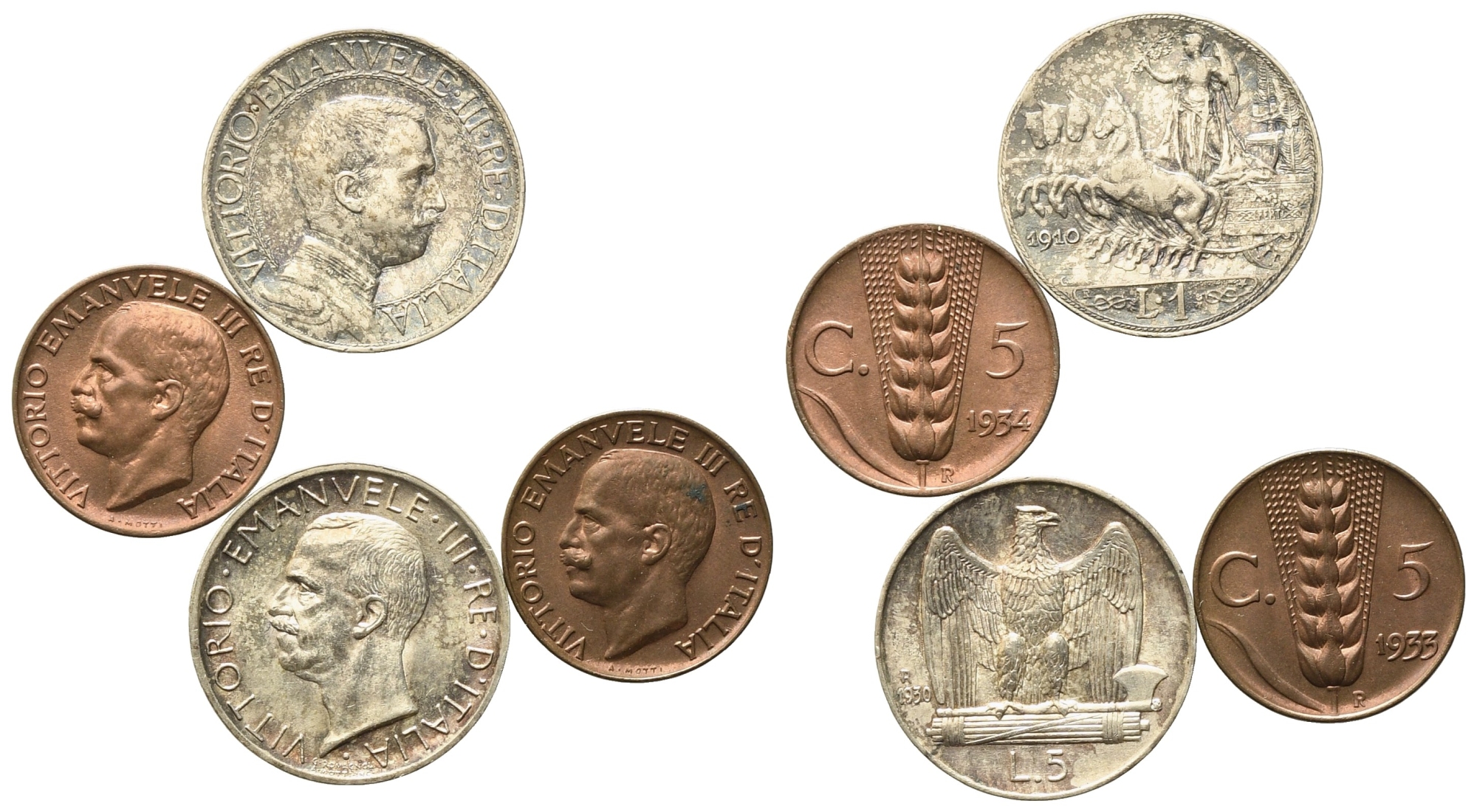 REGNO D'ITALIA. Lotto composto da n. 4 monete. Vittorio Emanuele III, 1 lira 1910 BB, 5 centesimi "Spiga" 1933 SPL, 1934 SPL e 5 lire 1930. qFDC