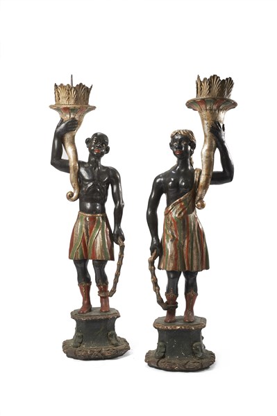 Coppia di mori reggitorcia in legno intagliato ed ebanizzato con portacandele in forma di cornucopia argentata, vesti policrome, basi a plinto. Secolo XVIII (h. cm 157) (difetti e restauri)