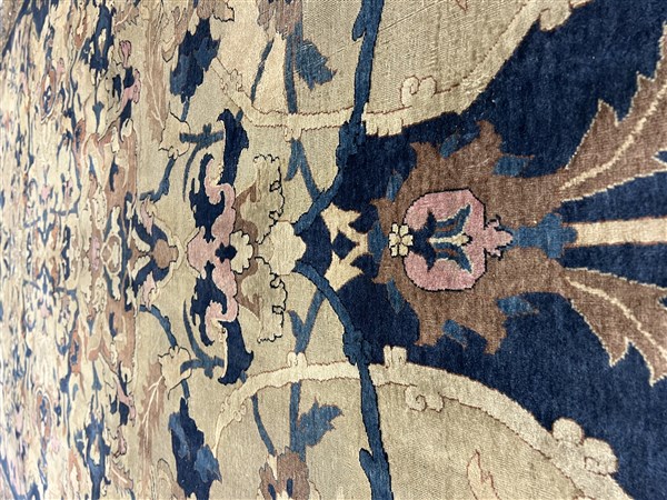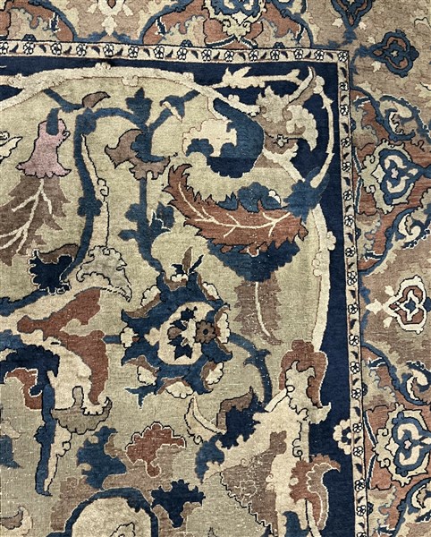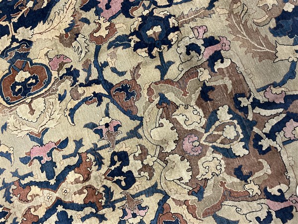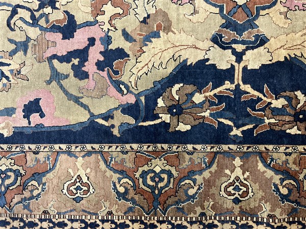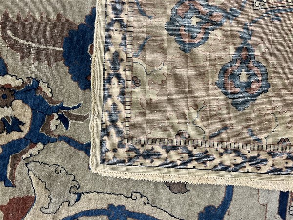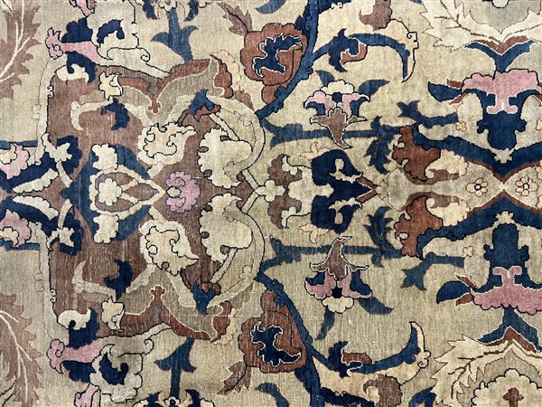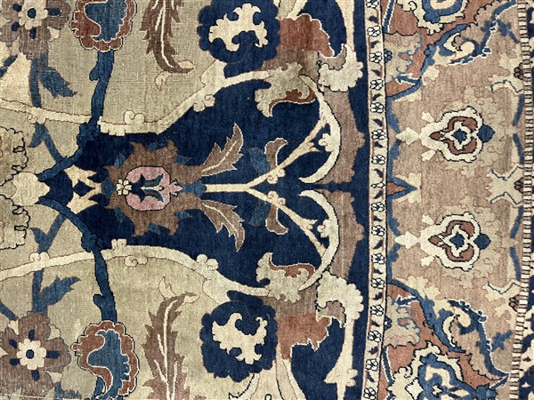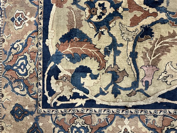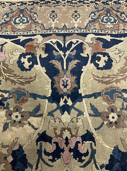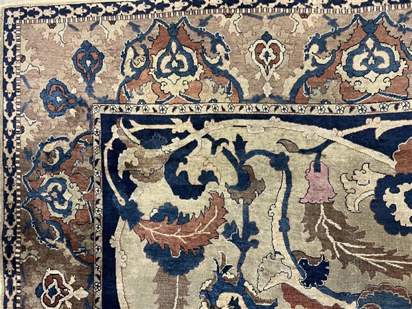 Tappeto Tabriz, Persia, inizio secolo XX. Decorazione ad ampio respiro con motivi floreali che si legano a formare riserve a fondo blu, nocciola, camoscio, beige, bianco e rosa su campo color crema. Bordura Herati realizzata con medesimo decoro. Piccola bordura esterna Medacyl nei toni del beige e blu (cm 528x303) (difetti e lievi rapature)