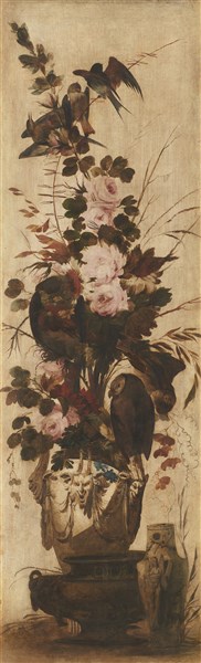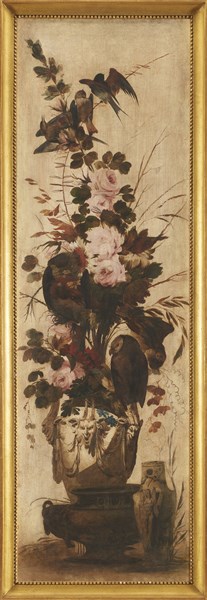 Giuseppe Bernardino Bison Composizione con vaso di fiori e volatiliTempera su