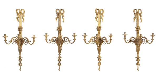Gruppo di quattro applique a tre fiamme in bronzo dorato. Portacandele sagomati sorretti da teste caprine e volto femminile sormontati da vasi fioriti con fiocchi. Decorati alla base a motivi vegetali e foglie con ghiande. Secolo XIX (h. cm 97) (difetti)