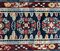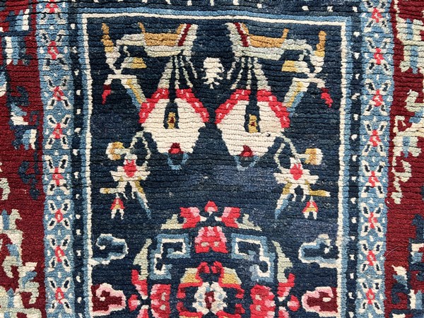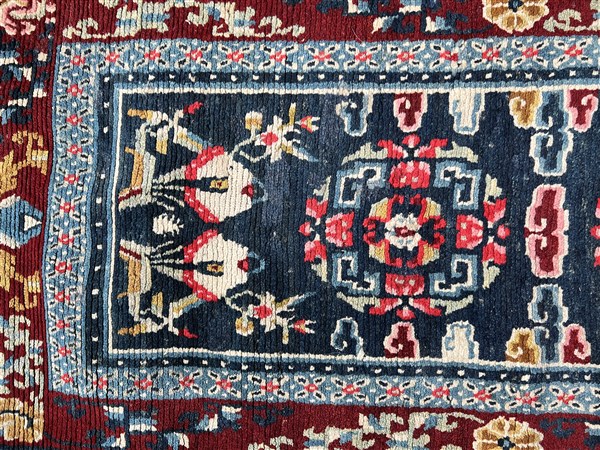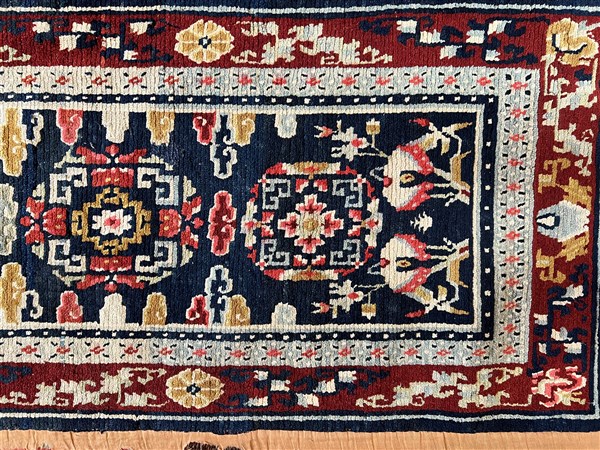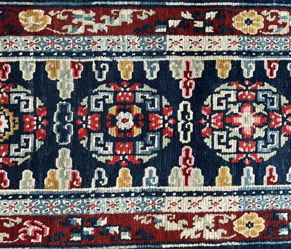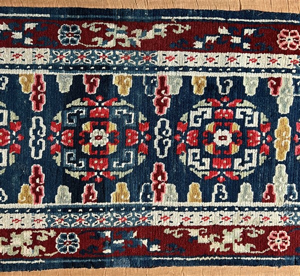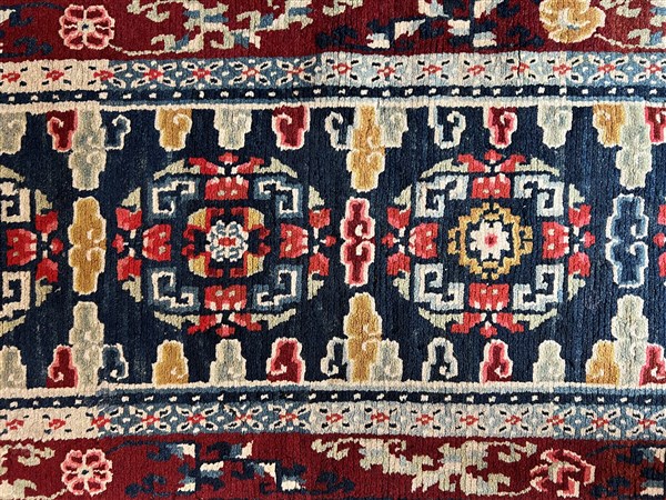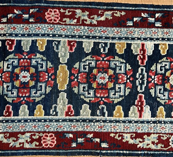 Tappeto passatoia Tibet, fine secolo XIX. Decoro composto da numerosi medaglioni a forma di mandala policromi su fondo blu Cina, completa la decorazione del campo una serie di nuvole policrome di differenti dimensioni, due piccole bordure interne a fiorellini a fondo azzurro, bordura principale a draghi stilizzati e motivi floreali su fondo bordeaux (cm 550x65) (difetti)