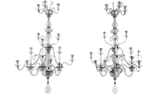 Coppia di grandi applique in cristallo a sedici luci disposte su tre file decorate da pendagli con fiori e perlinature. Fine secolo XIX - inizio XX (h. cm 190x90x64) (diverse mancanze e rifacimenti)