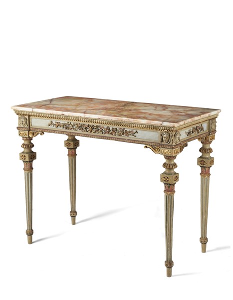 Lombard lacquered and gilded carved wooden console table. Onyx top (cm 120x90x60) (defects and restorations)