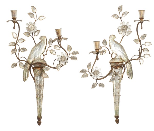 Coppia di applique a due fiamme in metallo e vetro a forma di lesena sormontata da pappagallo tra rami di foglie e fiori (h. tot cm 59) (difetti)
