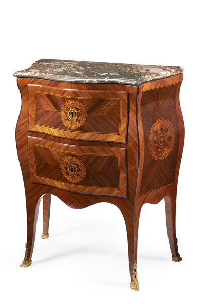 Comoncino di forma bombata, lastronato in palissandro e bois de rose, filettato in ebano e bosso, a due cassetti sul fronte, scarpette in bronzo e piano in breccia. Napoli, secolo XVIII (cm 70x87x39) (restauri)