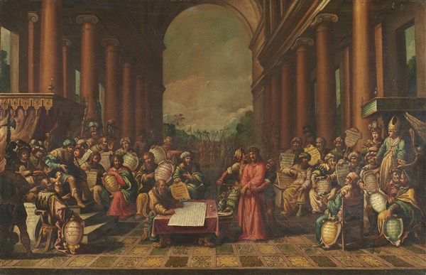 Scuola lombarda del secolo XVII Cristo davanti a Caifa Olio su tela, cm 73x