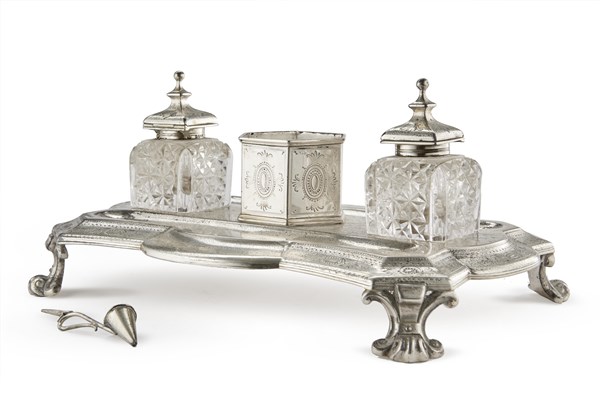 Calamaio in argento con doppio flacone in vetro molato e coperchio in argento cimato da sfera, basamento a profilo mistilineo inciso a volute su piedi a ricciolo, al centro vasca ottagonale. Londra, 1882 (cm 30x13) (g 660) (difetti e mancanze)
