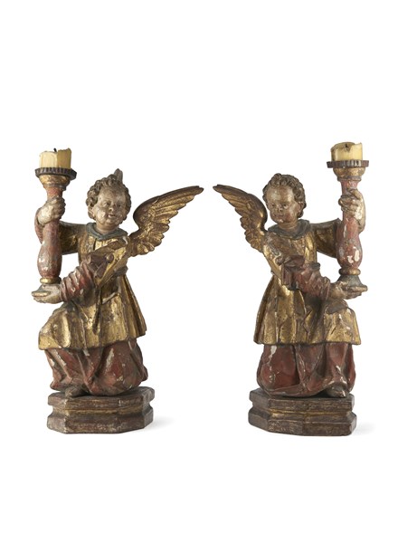 Scultore del secolo XVII. Coppia di angeli portacero in legno intagliato, dipin