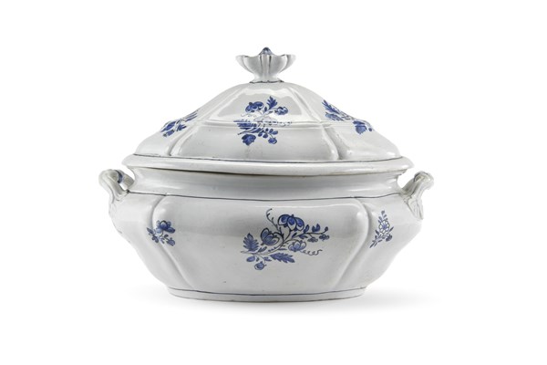 Manifattura Ginori, Doccia, secolo XVIII. Zuppiera biansata con coperchio in porcellana decorata in blu a mazzetti di fiori. Presa del coperchio a tutto tondo (L. cm 30; h. cm 21) (difetti e restauri)