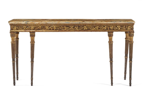 Antica console in legno intagliato, dorato e laccato con fascia riccamente decorata a tralci di vite con uva, gambe a colonna scanalata con capitelli intagliati a foglie d'acanto. Piano lastronato in marmo giallo di Siena (cm 172x91x37) (difetti e restauri)
