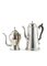 Caffettiera in argento con corpo liscio e coperchio cimato da presa a trottola, manico in legno. Londra, 1936. Unita a una caffettiera in argento con doppio serbatoio, corpo liscio e bordo dentellato, coperchio con presa a trottola e manico incannucciato. Punzoni di fantasia (h. max cm 21,5) (g lordi 1100) (difetti)