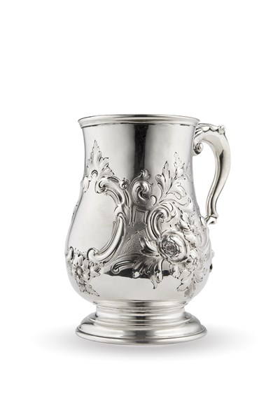Mug in argento con corpo piriforme sbalzato a motivi floreali e volute formanti una riserva sul fronte. Manico a doppia voluta contrapposta e interno in vermeil. Londra, 1873 (h. cm 17) (g 600) (lievi difetti)