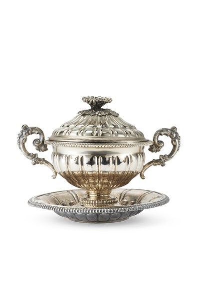 Zuccheriera biansata con coperchio e piatto in argento sbalzato, presa a fiore, bordi godronati. Torino, secolo XIX. Argentiere Innocenzo Lupo (h. tot cm 15,5) (g 530) (difetti)