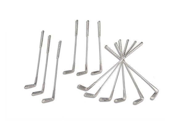 Dodici cucchiaini da cocktail in argento a forma di mazza da golf. Titolo 800 (