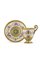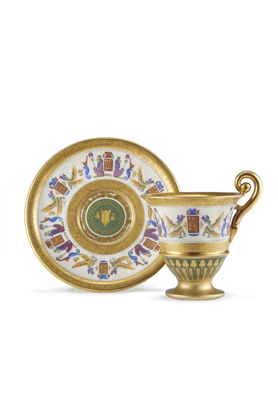 Manifattura francese del secolo XIX. Tazza con piatto in porcellana decorata in policromia con stilemi e figure egizie su fascia e bordure in oro e verde. Marcata alla base (tazza h. cm 11; piatto d. cm 14,8) (restauro alla base della tazza)