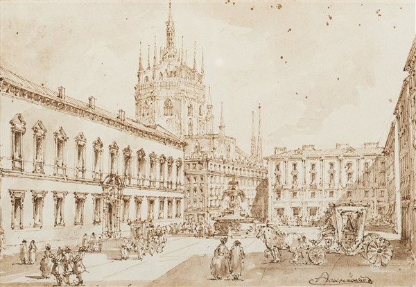 Giuseppe Latini Veduta di Piazza Fontana penna, inchiostro bruno, acquerello br